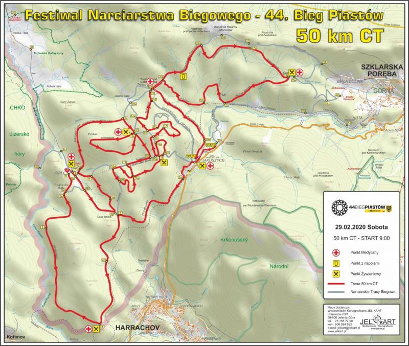 START na Polanie Maliszewskiego - trasa w lesie równoległa do Polany Jakuszyckiej - za strzelnicą - Spacerowa - Rozdroże pod Działem Izerskim - wokół Koziego Grzbietu - Orle - Spacerowa - Rozdroże pod Działem Izerskim - Inhalacyjna - Elektrownia Turów (Szklarska Droga) do punkt 24 - w prawo do Zubka (pkt. 13) - Krogulec - Rozdroże Miedziane (12) - w dół Samolotu do punktu 11 - dalej: 11a - 10a - Justynki (do 10) - Volvo (10-11a-15) - Maćkowiaka - Cicha Równia - Jeleniogórska - Czekolada - TV Polonia - Rozdroże pod Cichą Równią - droga na kopalnię - Niematematyczna - Dzielne Klapki - Czerwony Potok - PKO Banku Polskiego Zimowa - Woda Mineralna - Bez Łaski - Rozdroże pod Cichą Równią - Dolny Dukt - finisz na końcówce Dolnego Duktu - META.
