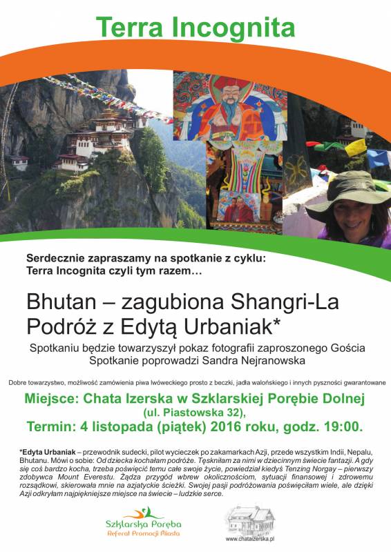 *Edyta Urbaniak – przewodnik sudecki, pilot wycieczek po zakamarkach Azji, przede wszystkim Indii, Nepalu, Bhutanu. Mówi o sobie: Od dziecka kochałam podróże. Tęskniłam za nimi w dziecinnym świecie fantazji. A gdy się coś bardzo kocha, trzeba poświęcić temu całe swoje życie, powiedział kiedyś Tenzing Norgay – pierwszy zdobywca Mount Everestu. Żądza przygód wbrew okolicznościom, sytuacji finansowej i zdrowemu rozsądkowi, skierowała mnie na azjatyckie ścieżki. Swojej pasji podróżowania poświęciłam wiele, ale dzięki Azji odkryłam najpiękniejsze miejsce na świecie – ludzkie serce.