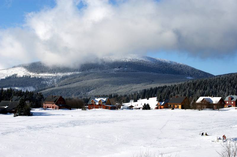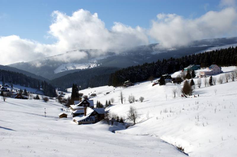 Gleich hinter dem Gebirgspass Okraj kann man die malerisch gelegene Ortschaft Mala Upa mit typischen, Riesengebirgshütten, zerstreut auf den Abhängen, finden. Am Jahresende verwandelt sich dieses ruhige , tschechische Dorf in ein, unter den Touristen bekanntes Zentrum des Wintersports.