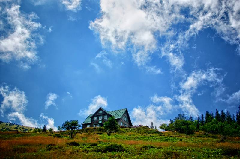 the Karkonosze Centre of Ecological Education in Szklarska Poręba, located just at the bottom of the lift station. The exhibition ”Virtual Mountains” awaits visitors- it is a large panorama and a 3D model of the Karkonosze mountains. In an interactive way they present, among other things; glacial cauldrons, bogs, fauna and flora, forests, natural phenomena, and the influence of humans on the mountains. In the workshop hall you can observe nature using binoculars. When you reach the top, turn left along the red trail and go in the direction of the radio and TV broadcasting station, which is visible, hanging just above the Śnieżne Kotły. Walking along the border after passing Twarożnik, turn to the Czech side towards the source of the Łaba river and then continue to the Labska Bouda hut. The return journey will lead you again across the border to the hut “Schronisko pod Łabskim Szczytem”. Then you should continue going down the yellow trail to Szklarska Poręba.